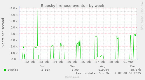 At the moment, the firehose flow ranges between ~300 and 700 events per second during the day ("event" being one "action" like created or deleted record of any kind), with the bottom around 7-9:00 UTC and the top around 17-22:00 UTC. But the highest bandwidth we've seen so far was around 1.8-2.0k events/s in mid November, when a massive new wave of new users joined in the aftermath of the US elections, and we've seen the traffic go up rapidly by a few hundred % within days before too, e.g. in early September when the whole Brazil joined Bluesky. The firehose protocol also includes a lot of extra data, needed for cryptographic verification and full replication of data repositories, but not used in a simple case like this – so the total data bandwidth to stream and process is an average ~20-30 Mbps right now (with the smaller traffic than before).