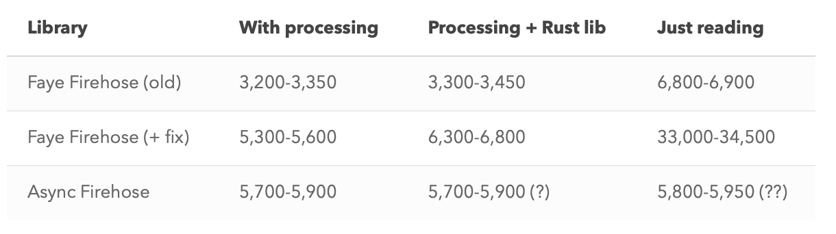 The second thing is that I started doing some profiling to find out where else I could save some processing time, and in the process, I managed to massively speed up the underlying faye-websocket library 🙃