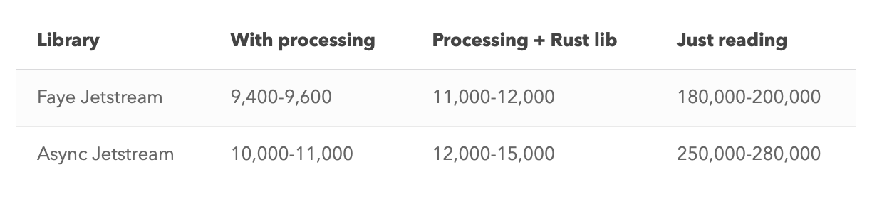 Jetstream mode, without the rate limit, can be around 2x faster than the Firehose version in practice